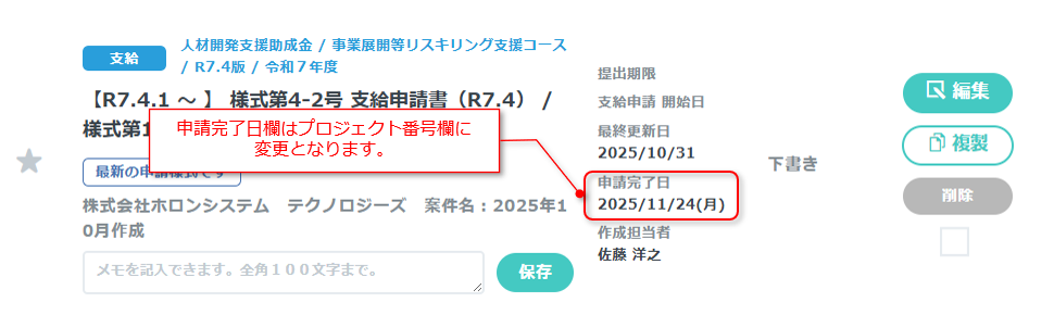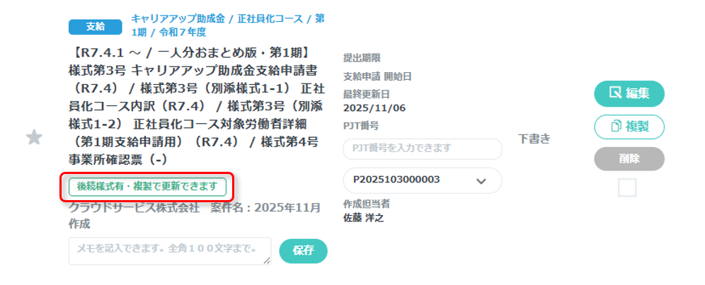 申請書一覧画面において、これまでは最新の様式の場合は青文字で「最新の様式です」の表示、様式の更新がある場合、後続となる様式がある場合は、一律「様式更新あり 複製で最新版化できます」と赤字で表示していました。こちらの識別が難しいとご要望いただいていたことから、今回の機能強化で厚労省が様式の更新を行った場合は、赤字で「様式更新あり 複製で最新版化できます」と表示、そして新たに、後続となる様式が存在する場合(第1期作成時の第2期など)は、「後続様式あり」と緑文字で表示するようになり、対応判断が行いやすくなりました。