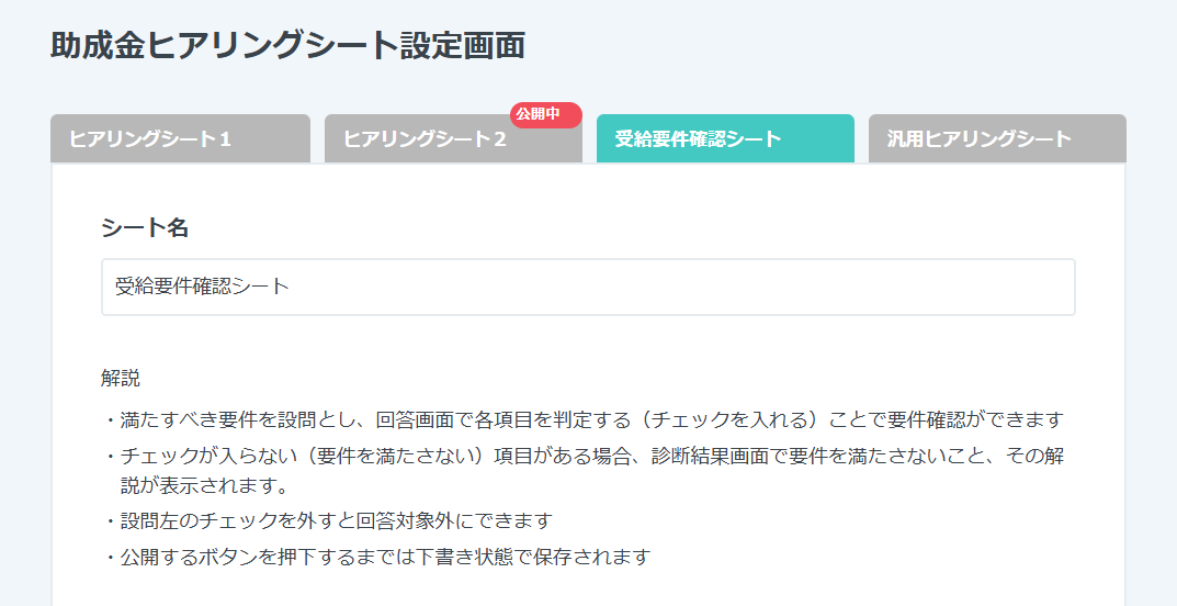 | ●2つの助成金ヒアリングシートを内容を変えて運用できるようになりました。 ●要件確認ヒアリングシートを新たに追加し、お客様が助成金申請の要件を満たすかシートを利用して確認できるようになりました。 ●汎用用途で利用できる汎用ヒアリングシートも追加しています。 ●それぞれのヒアリングシートが公開中かどうかタブ上で表示するようにしました。 ●その他、ヒアリングシートの設問が初期値のままの場合、年次の要件変更などの更新サービスをご提供します。 |