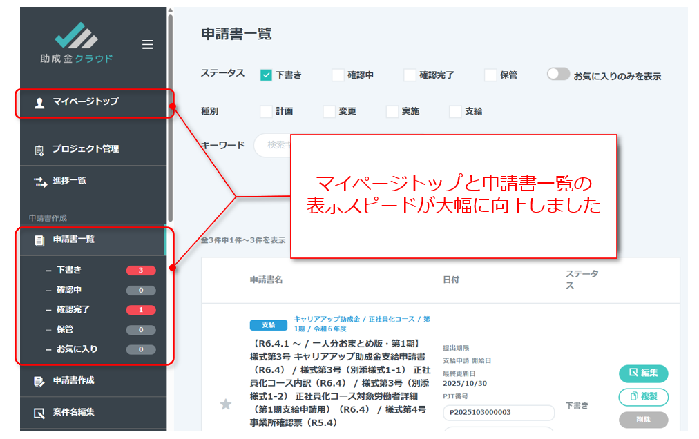 マイページトップや申請書一覧(サブフォルダ含む)の表示速度を大幅に向上させるシステム改修を実施しました(当社比25倍)。また、助成金クラウドが動作するWebアプリケーションの動作環境を最新化し、速度向上のみならずセキュリティ面での堅牢性の向上もはかっています。