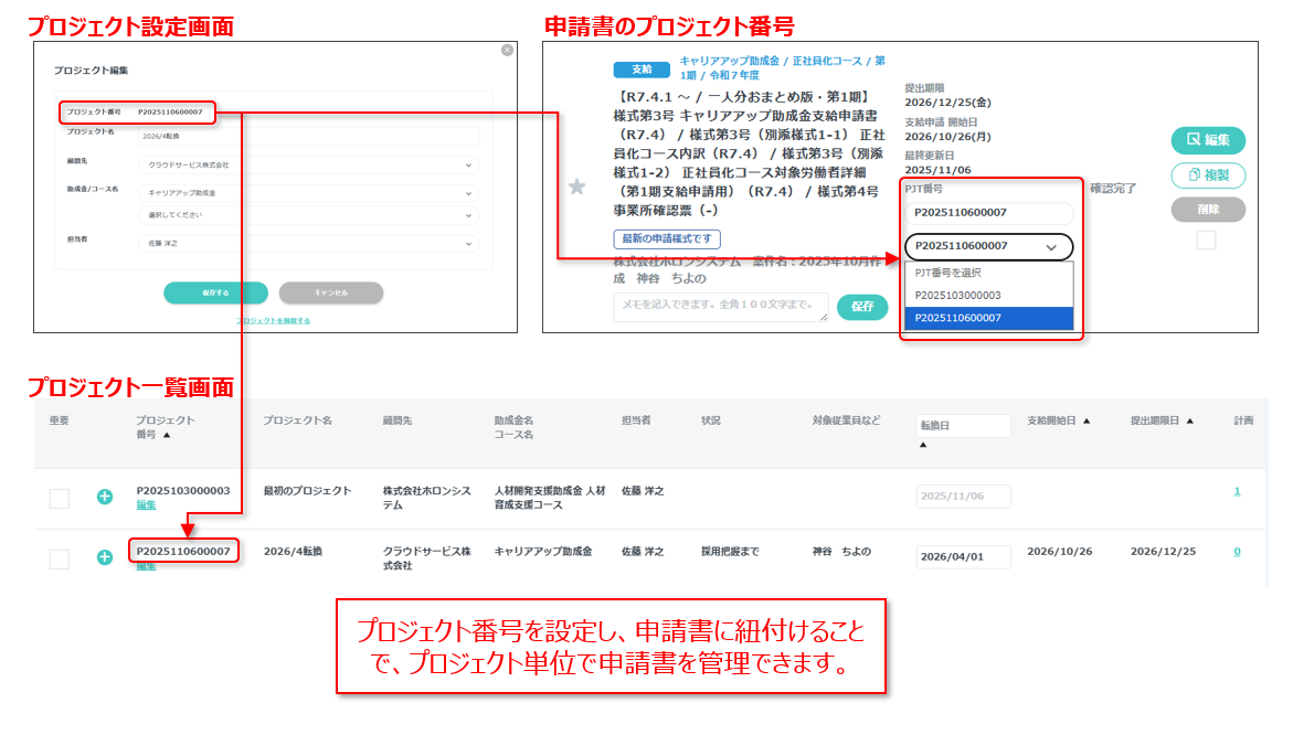 | ●進捗管理のトリガーは「プロジェクト番号」。異なる顧問先や複数の助成金の申請書も共通のプロジェクト番号を設定することで、ひとつのプロジェクトとして管理できます。 ●プロジェクト毎に計画届や支給申請の作成状況や件数を一目で把握可能です。 ●プロジェクトに従属する申請書もプロジェクト番号を変更することで簡単に別プロジェクトに移設できます。 ●進捗管理の項目は自由に設定できる10項目を用意しています。 ●提出期限日や支給申請開始日、対象労働者名は、申請書から自動で参照されます。 |